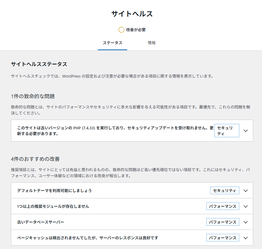 - バージョン変更後の確認項目。ダッシュボード又はサイトヘルスチェック