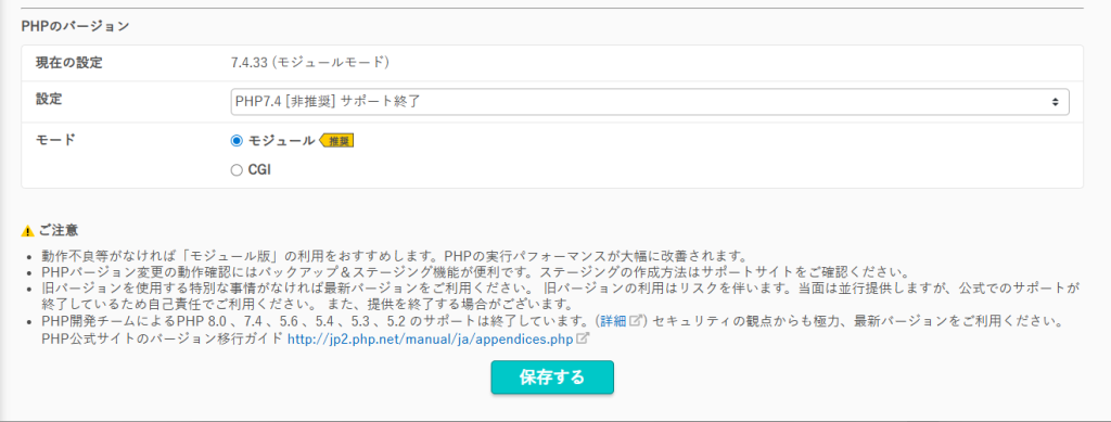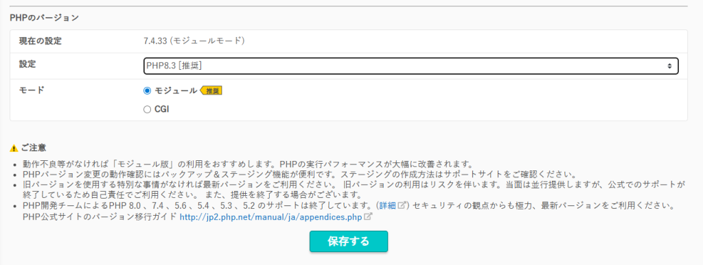 今回は、「PHPのバージョン」で「PHP 8.3(推奨)」を選択します。モードは「モジュール版」で保存ボタンを押下する。