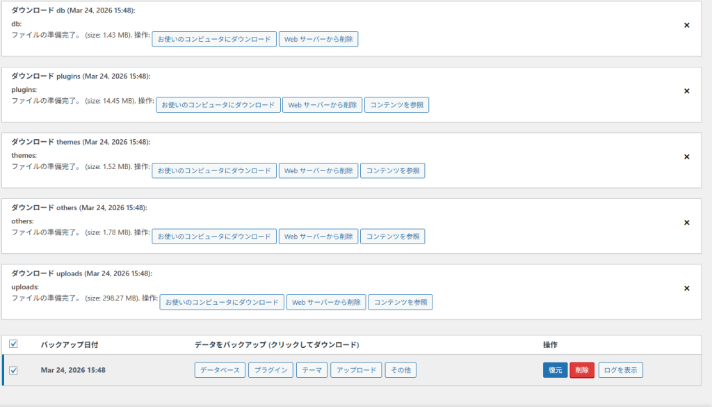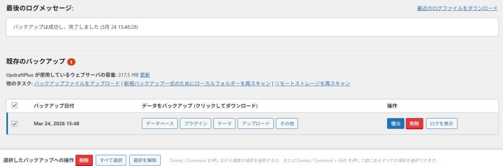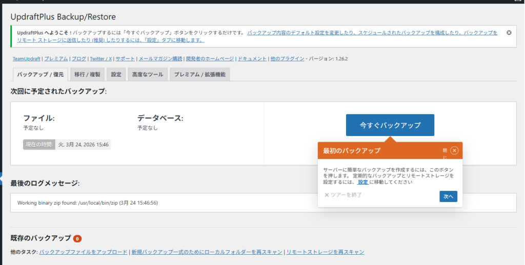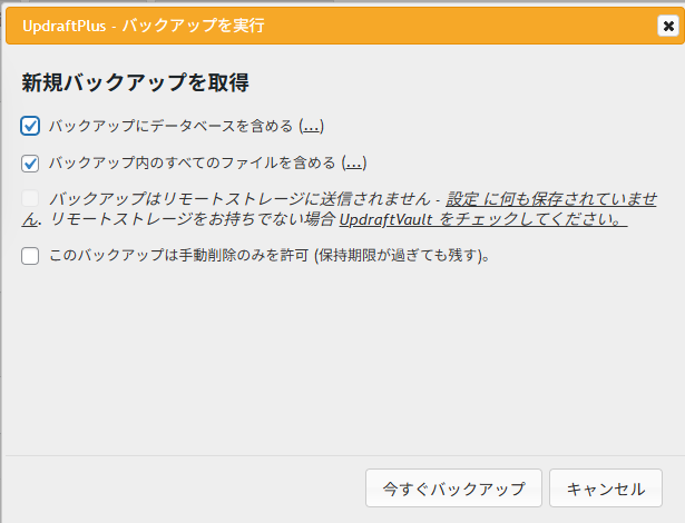 バージョンアップ前のバックアップ取得。今回はUpdraftPlusプラグインを利用