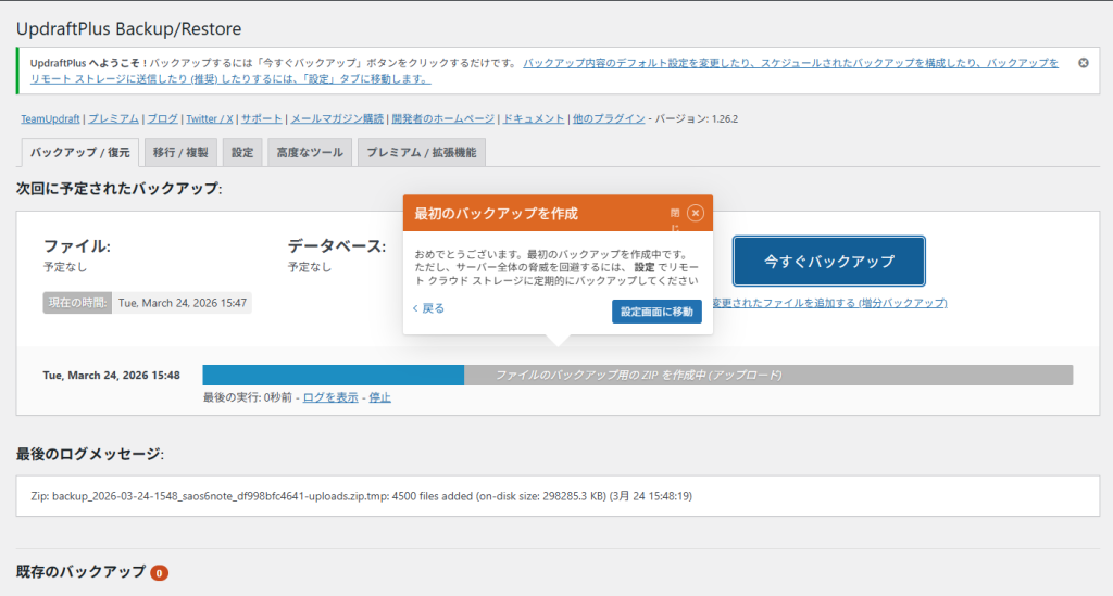 今回は手動で「今すぐバックアップ」を行いました。「設定」タブより定期バックアップの設定もあるが。