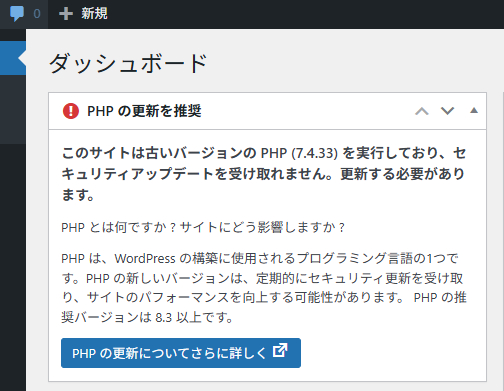 WordPress 環境で PHP バージョンUPの方法 当サイトはWordPress運営してますが、 以前より以下のメッセージが、色々調べて今回は対応してみる事に。 このサイトは古いバージョンの PHP (7.4.33) を実行しており、セキュリティアップデートを受け取れません。更新する必要があります。 WordPress環境のPHPバージョンUPを行う手順を調べたところ 事前に状態を確認する。 […]